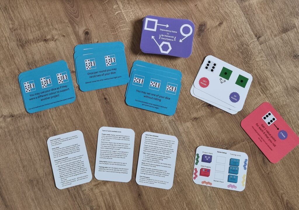 The Dependency Game examines team dynamics in a simulated scenario of teams drowning in dependencies. The game’s simple mechanics rely on several sets of dice of different colours and a deck of cards that offer opportunities to deliver value, but require collaboration between different teams.